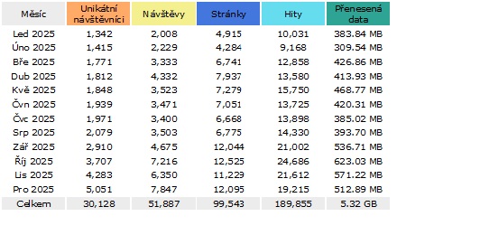 Návštěvnost našich stránek v průběhu roku 2025 trvale rostla, až v prosinci překonala hranici pěti tisíc individuálních návštěv. Více si můžete prohlédnout níže.